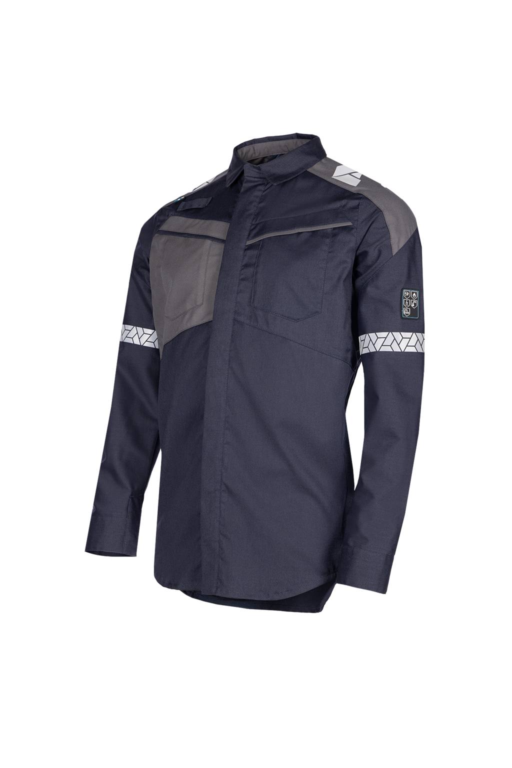 The Rojas shirt combines certified flame-retardant, anti-static and ARC protection with a first barrier against liquid chemicals. Made from modacrylic, aramid and elastane, it offers inherent safety, strength and flexibility. The navy blue/anthracite grey colour combination with retroreflective tape ensures EN 17353 B2 enhanced visibility for medium-risk environments. A versatile protective item that moves with you in comfort and confidence.