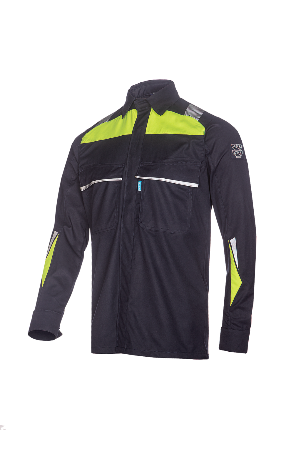 A stylish protective navy shirt with a splash of hi-vis yellow and segmented reflective tape on the shoulders, that is the Rufford. This multi-norm shirt not only offers limited protection against liquid chemicals (EN 13034), it also complies to IEC 61482-2, EN ISO 11612 and EN 1149-5. The chest pockets of this shirt are finished with a touch of reflective material, making this classy shirt stand out.