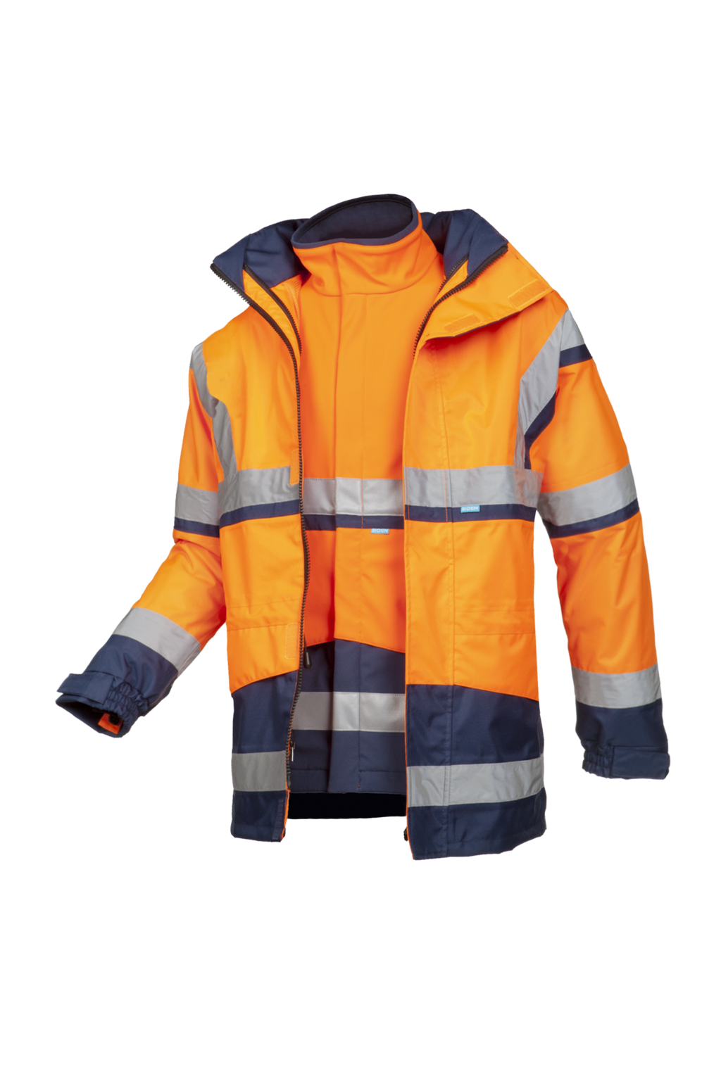 Looking for a work outfit suitable for all-weather conditions? The Powell hi-vis rain parka meets all your needs with its removable softshell jacket. This high-quality 4-in-1 model is made from a strong yet light, supple and breathable fabric. The rain parka with knitted wind cuffs in the sleeves has a detachable hood, two pockets on the outside, one inside pocket and one Napoleon pocket. Through the elastic cord in the waist and the elastic wristband, you can adapt this light raincoat fully to your body. The removable softshell jacket has one inside pocket and two side pockets. The detachable sleeves have an elastic at the end.